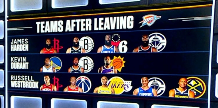 2012年,杜兰特、威少和哈登率雷霆打进总决赛,他们三人在离队后换队数量如下: