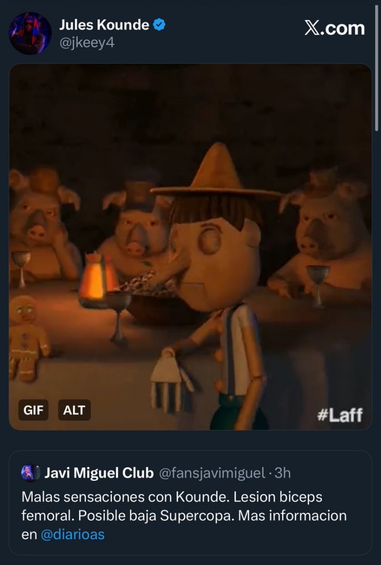 记者Javi Miguel社媒表示,孔德的伤情令人担忧,初步诊断为股二头肌受伤,可能缺席西班牙超级杯。