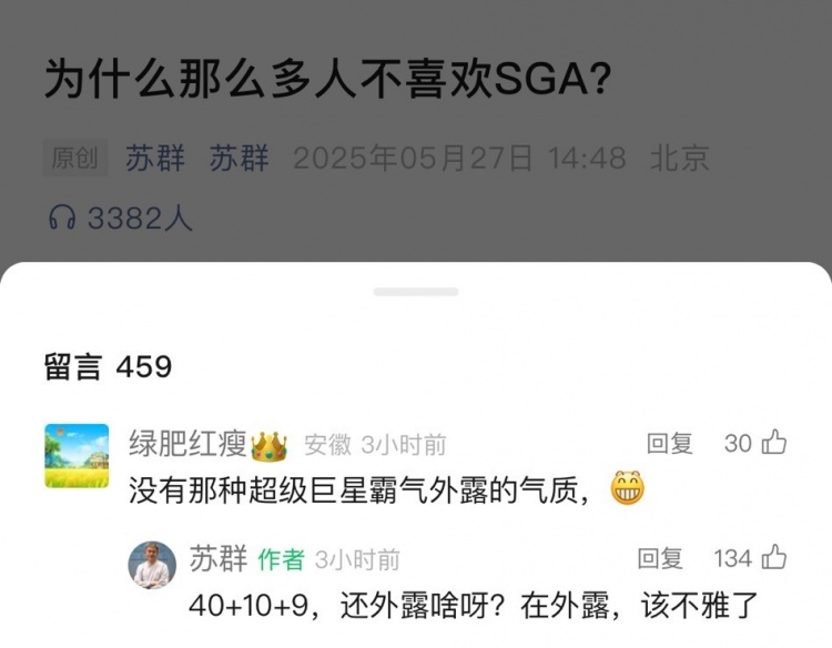 赛后,篮球解说员苏群发文《为什么那么多人不喜欢SGA?》,在评论区,苏群和球迷互动。